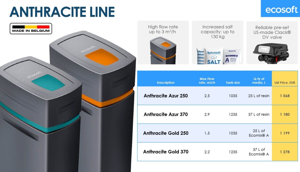 Statia automata Ecosoft Anthracite Azure 250 contine 25 de litri de rasina pentru dedurizare si asigura un debit nominal de 2.5 m3/h de apa tratata. Acest debit variaza in functie de duritatea apei si poate ajunge pana la 3 m3/h.